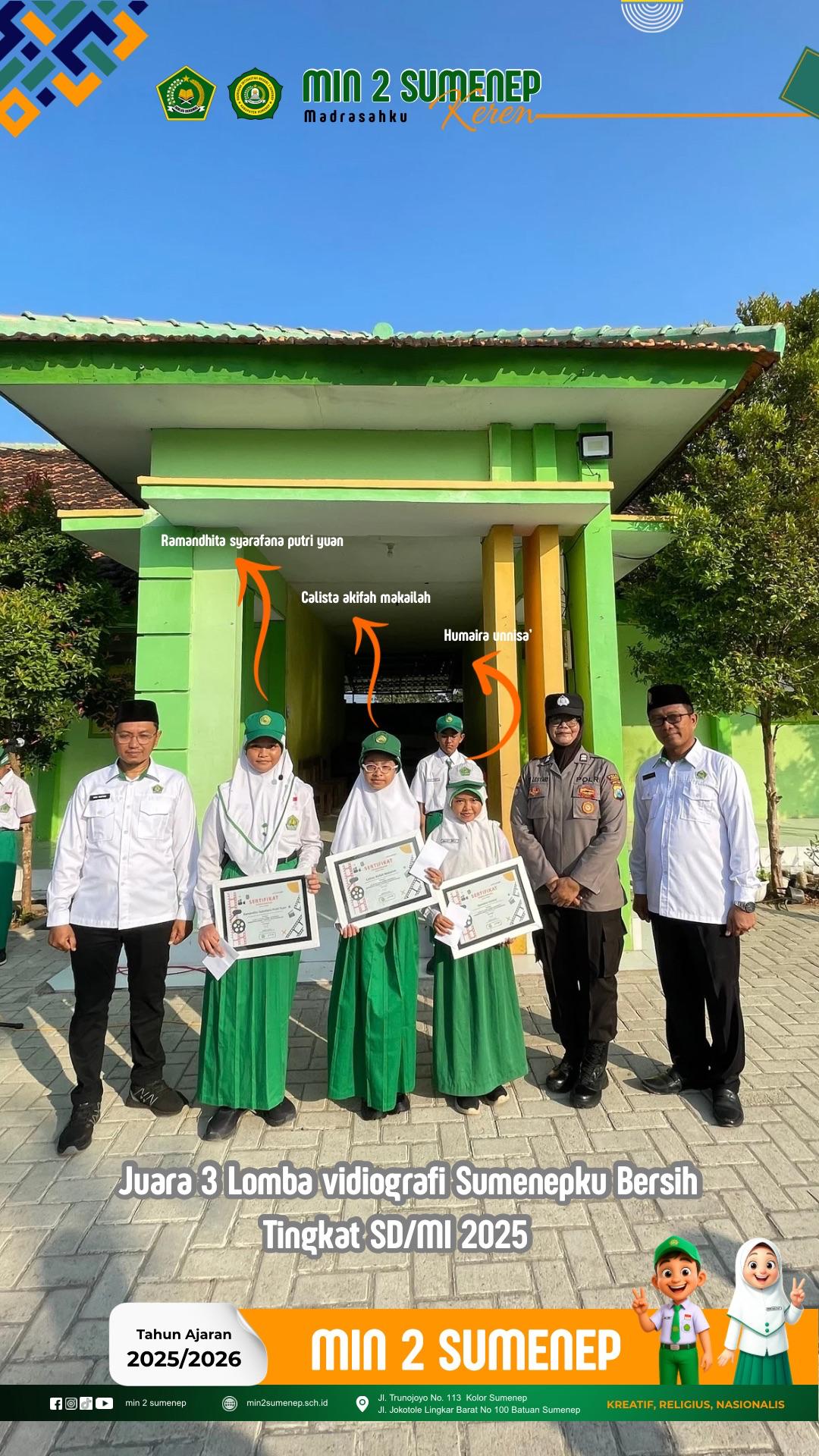 Setelah upacara, kegiatan dilanjutkan dengan pemberian penghargaan kepada siswa berprestasi yang telah meraih juara 3 lomba videografi dengan tema "Sumenepku Bersih" jenjang SD/MI tingkat Kabupaten Sumenep. Siswa tersebut bernama Calista Akifah Makailah, Humaira Unnisa', dan Ramandita Syarafana Putri Yuan. Momen ini menjadi inspirasi bagi siswa lain untuk terus berprestasi.