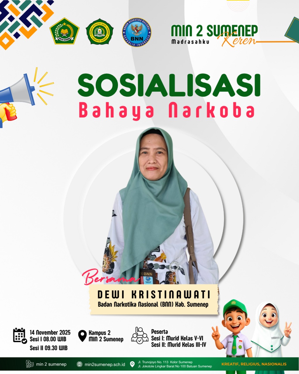 Sumenep – Sebagai upaya preventif dan edukasi dini terhadap ancaman penyalahgunaan narkotika, Madrasah Ibtidaiyah Negeri (MIN) 2 Sumenep bekerja sama dengan Badan Narkotika Nasional (BNN) Kabupaten Sumenep mengadakan kegiatan sosialisasi bahaya narkoba.