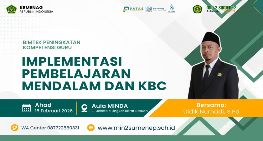 Sumenep – Dalam upaya berkelanjutan untuk meningkatkan mutu pendidikan dan kompetensi tenaga pendidik, MIN 2 Sumenep sukses menyelenggarakan Bimbingan Teknis (Bimtek) Peningkatan Kompetensi Guru. Mengangkat tema "Implementasi Pembelajaran Mendalam dan KBC", kegiatan ini berlangsung pada hari Ahad, 15 Februari 2026, bertempat di Aula MINDA.